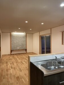 2025年11月に完成しました建売を販売致します。LDKと玄関周りは真壁造りで漆喰、外壁材は塗り壁を使用しております。床材も無垢材を使用しており、自然素材が多く過ごしやすい室内環境となっております。外構のみまだ工事中となっております。
